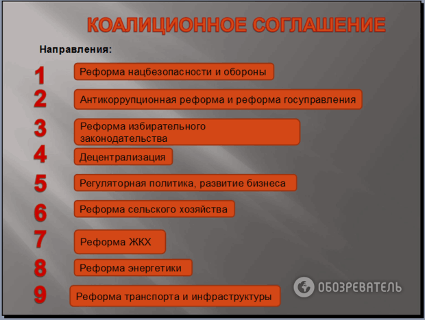 Всего в Коалиционном соглашении содержится 513 пунктов, обязательных к выполнению. Из них на первый квартал 2015 года приходится около 100 обязательств. То есть, это только те задачи, которые по состоянию на 1 апреля 2015 года должны перейти в статус "Выполнено". При этом, речь даже не идет об оценке реализации заявленных задач на практике. Лишь о законодательном их закреплении в том или ином законе.