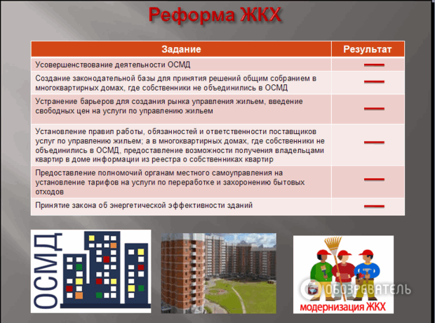 1) усовершенствование деятельности объединения совладельцев многоквартирного дома (ОСМД), в том числе путем введения обязательности решений ОСМД для всех владельцев в домах, где они созданы, ввести справедливый порядок определения голосов, принадлежащих каждому совладельцу, четко закрепить ответственность владельцев относительно друг друга, ОСМД и третьих лиц (не выполнено)