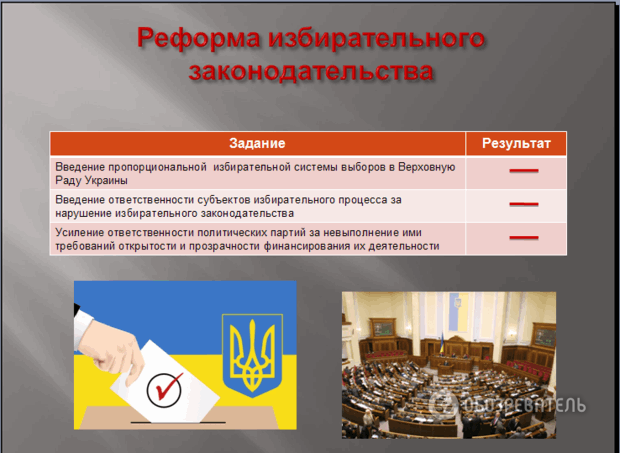 1) отказ от смешанной (пропорционально-мажоритарной) избирательной системы и введение пропорциональной избирательной системы выборов в Верховную Раду Украины (не выполнено)