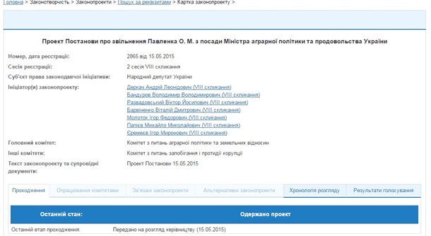 Те же депутаты зарегистрировали проект постановления №2865 об увольнении Алексея Павленко с должности министра аграрной политики и продовольствия.