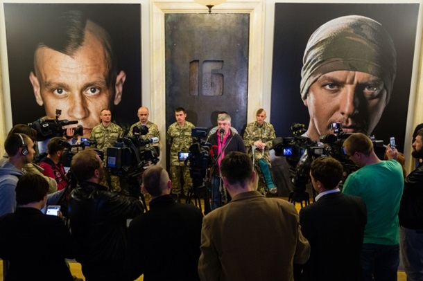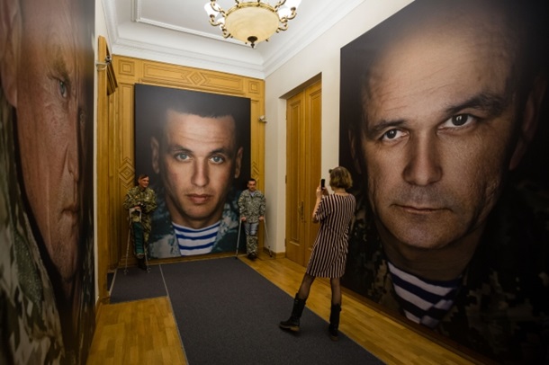 Состоит выставка из фотографий 16 воинов АТО, которые, по словам президента, своей жертвенностью и отвагой "прославили Украину в веках".