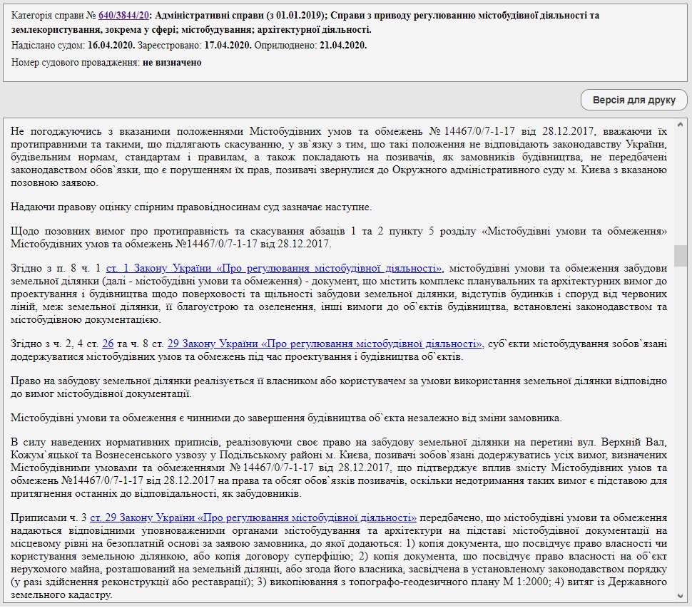 ЧАО “ФПГ “Атика” и ООО “Феликсия”, похоже, остались недовольны выданным ГУО – в начале 2020 года фирмы обратились в ОАСК с иском о признании противоправными и “полной” отмене двух пунктов ГУО (п.п. 1 и 2), а также семи абзацев п.5. Истцы ссылались на то, что арендованные ими участки безосновательно отнесены к границам заповедника “Древний Киев”, памятников “Исторический ландшафт Киевских гор и долины р. Днепр” и “Культурный слой Подола”. Причина – на момент рассмотрение дела в суде границы исторического ареала столицы не были утверждены в установленном законом порядке.