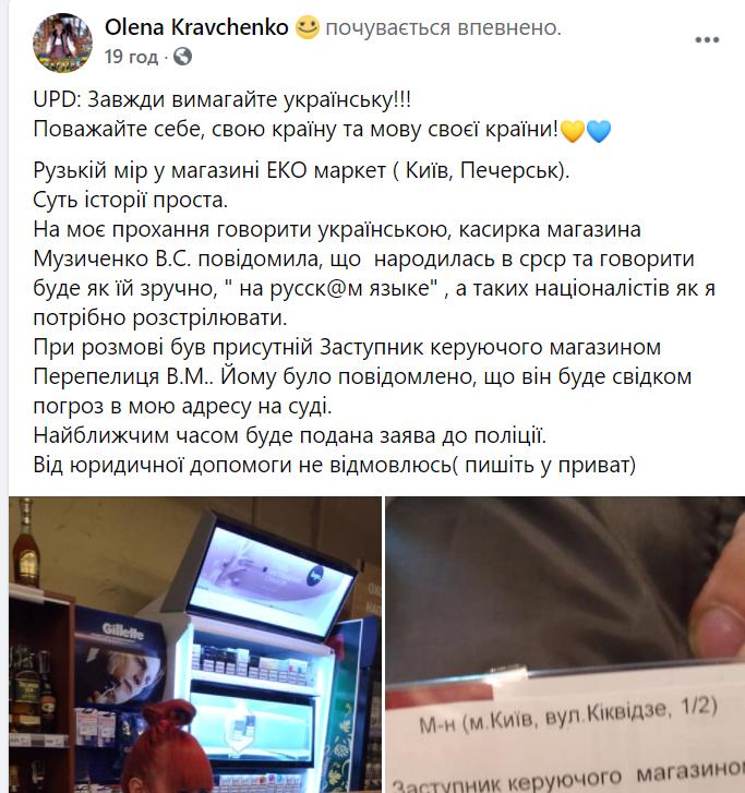 ” Завжди вимагайте українську!!! Поважайте себе, свою країну та мову своєї країни!”, – наголосила Кравченко.