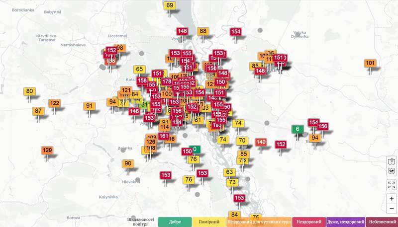 Наразі індекс забруднення повітря в Києві становить 154 при нормі у 50. Рівень забруднення характеризується як «нездоровий».