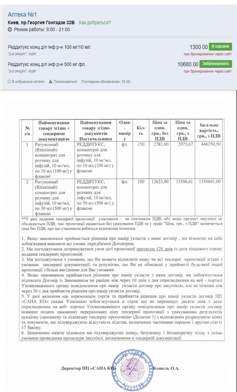 При этом неизменный победитель тендеров, ЧП «Сана Ко», поставляет онкодиспансеру препараты по ценам, значительно превышающим рыночные. Например, индийский препарат «Реддитукс» фирма поставляет по цене почти 3 тыс. грн за 10 мл и 13,5 тыс. грн за флакон 50 мл. При этом во многих розничных аптеках этот препарат стоит значительно дешевле: 1,3 тыс. грн и 10,6 тыс. грн соответственно. «Как видим из разницы в ценах, значительная часть этих средств просто осядет в карманах Лукьянчука и Кошель», — пишет telegram-канал.
