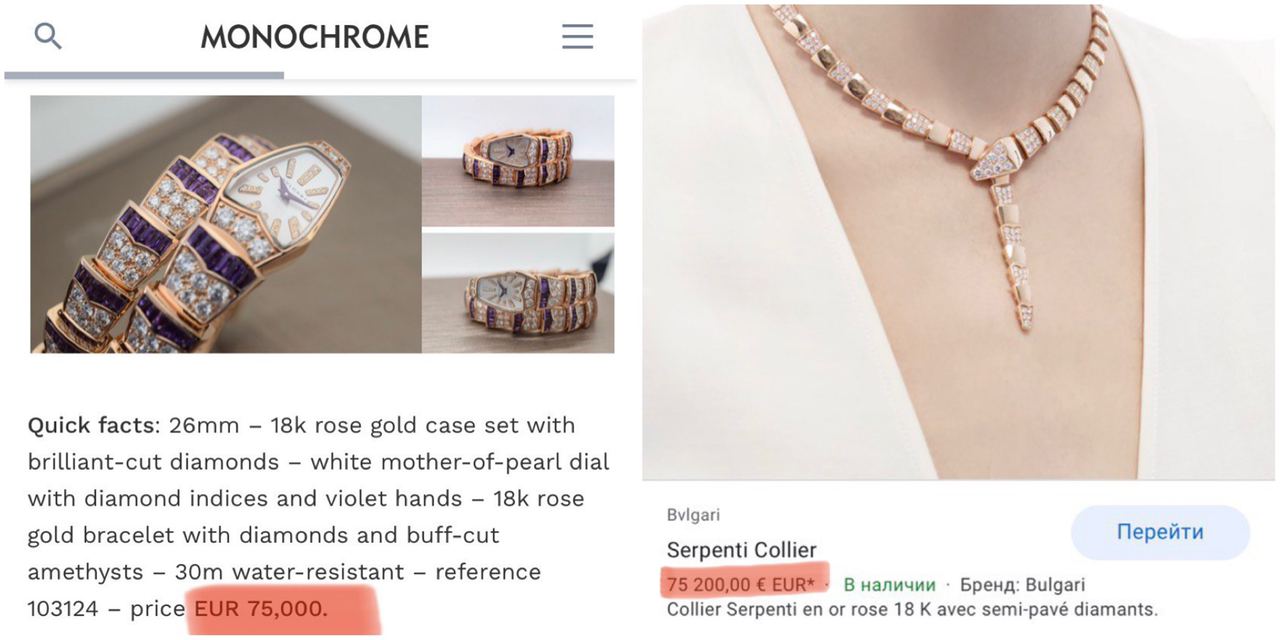 Корреспонденты обратили внимание, что на шее жены мэра бриллиантовая "змея" известного итальянского дома предметов роскоши Bvlgari. Как мы выяснили, это не единственное ювелирное украшение такого бренда класса люкс у Натальи.