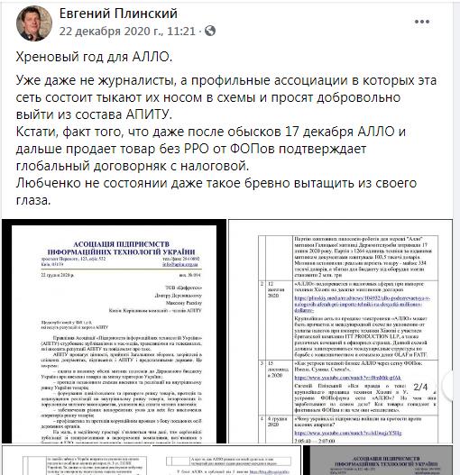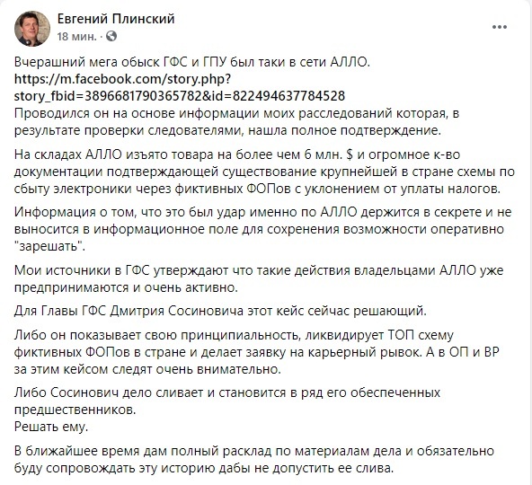 Так, он сообщил о том, что со складов компании «Алло» изъяли товары на сумму более 6 миллионов долларов, а также кучу компрометирующей документации.