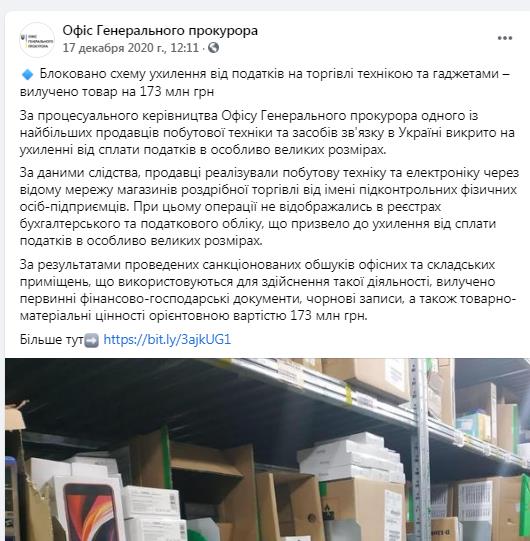 Кроме этого, сообщается, что во время обысков в офисах и складах компании «Алло» были изъяты документация и черновики, а также товарно-материальные ценности, стоимостью около 173 миллионов.