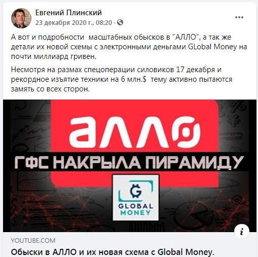 О многих подробностях грандиозного схематоза и скрутки между банком «Альянс», компании «Алло» и платежной системой «ГлобалМани» рассказал журналист Евгений Плинский.