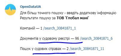 Стоит отметить, что компания ГлобалМани замешана во многих судебных распнях. Так за ней, согласно открытому сервису ОпенДата, числится 96 документов в судебном реестре и 2 судебных дела.