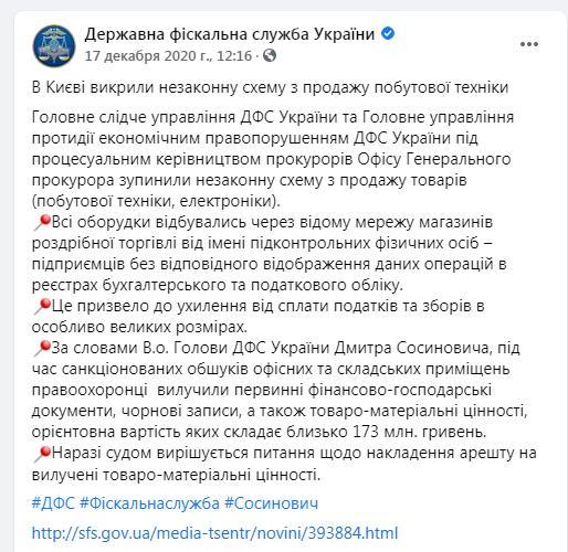 Напомним, 17 декабря прошлого года руководство Государственной фискальной службы Украины сообщило о раскрытии незаконных схем по продаже бытовой техники, что привело к уклонению от оплаты налогов и сборов в особо крупных размерах.