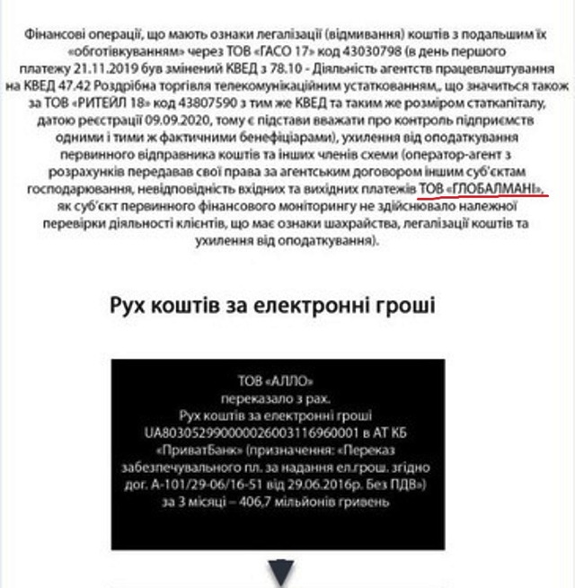 Так общественный резонанс вызвал скандал с компаниями «Алло» и ООО «ГАСО 17», которые на протяжении периода с ноября 2019-го по март 2020-го провели финансовых операций через платежную систему ГлобалМани на общую сумму более 800 миллионов гривен. И такие операции имеют все признаки мошенничества с финансовыми ресурсами и легализацией доходов, которые получены преступным путем в особо крупных размерах. Далее – подробнее о схемах.