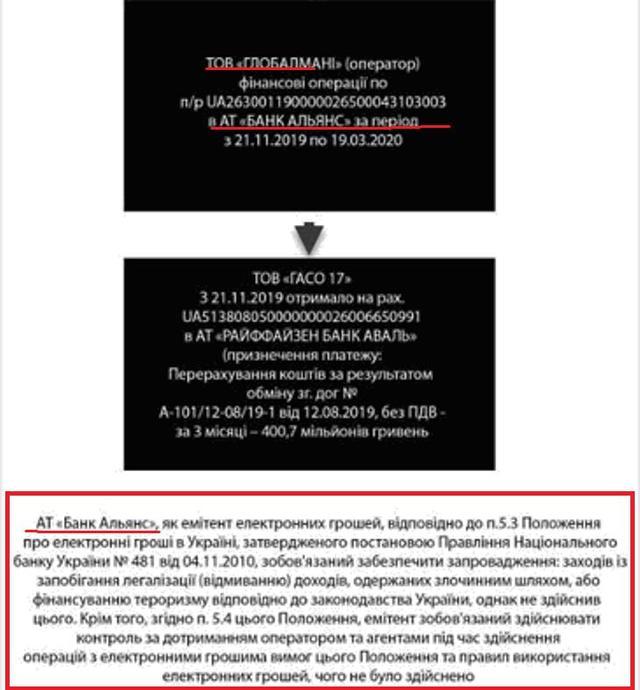 В ходе расследования выяснилось, что банком «Альянс» осуществлялась эмиссия электронных денег системы ГлобалМани. Следовательно, по действующему законодательству нашей страны, банк был обязан обеспечить систему противостояния отмыванию доходов, которые были получены незаконным путем. Но и это еще не все. Финансы GlobalMoney к тому же поступали на счета банка «Альянс». И эта коррупционная схема начала работать четко с ноября 2019-го, когда «Альянс» стал эмитентом электронных денег платежной системы ООО «ГлобалМани».
