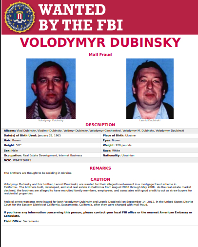 Суммарно им светит около 50 лет тюремного заключения – каждому. Вот уже девятый год, как братья Владимир и Леонид Дубинские объявлены ФБР в розыск. Их подозревают в масштабном мошенничестве, жертвами которого стали около сотни частных инвесторов и как минимум один американский банк. По подсчетам американских журналистов, сумма убытков от их аферы с недвижимостью в Калифорнии составляет не менее 52 миллионов долларов США.