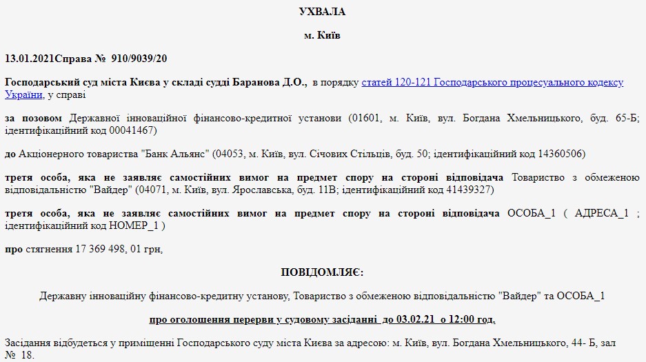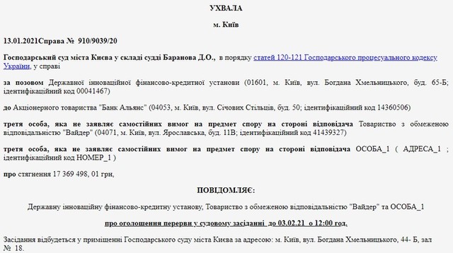 В одном из хозяйственных дел, которое рассматривается Хозяйственным судом города Киева, государственная структура – «Государственное инновационное кредитно-финансовое учреждение» обратилась с иском о возврате 17,3 миллионов гривен у «Банк Альянс» в связи с неисполнением взятых обязательств. Это хозяйственное дело началось летом 2020 года, по сегодняшний день заседания суда постоянно переноситься из-за различных ходатайств сторон и третьих лиц. Очередное заседания Хозяйственного суда в этом деле происходило вчера, но о его результатах пока неизвестно.