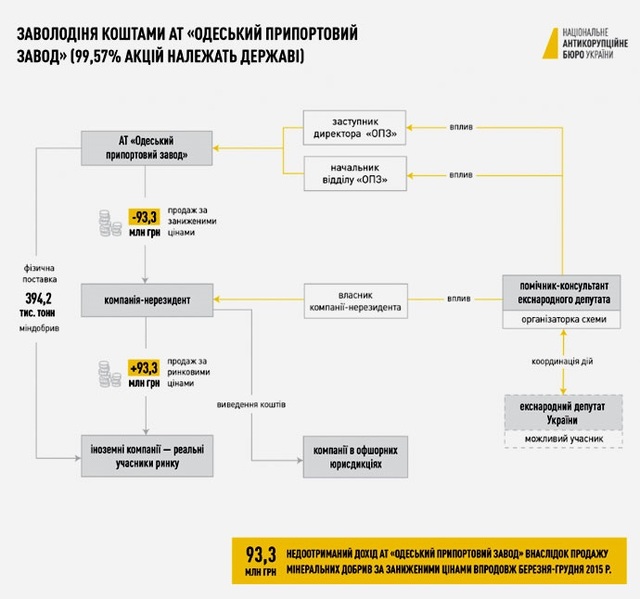 Одесский припортовый стал продавать эти же удобрения опять же малоизвестной британской фирме Newscope Estates Ltd. При этом предоставив ей пятипроцентную скидку. Продали удобрений на 1 миллиард 630 миллионов гривен. И эта скидка в 5% и явилась камнем преткновения – в НАБУ посчитали, что на самом деле это простой «откат», который украли у государства. И составил он, по подсчетам НАБУ, 93,3 миллиона гривен. Почему ущерб получило государство? Потому что 99,57% акций ПАО «Одесский припортовый завод» принадлежит именно государству. А убыток состоял в том, что Newscope Estates Ltd продала потом эти удобрения по рыночной стоимости, а разницу поделили между собой участники схемы.