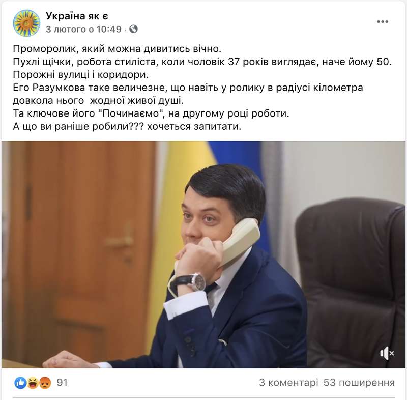 Багато уваги, особливо впродовж останніх днів, сторінки приділяють Дмитрові Разумкову. На рекламні атаки проти голови Верховної Ради тільки за лютий 2021 року витрачено від 1400 до 1800 доларів США.