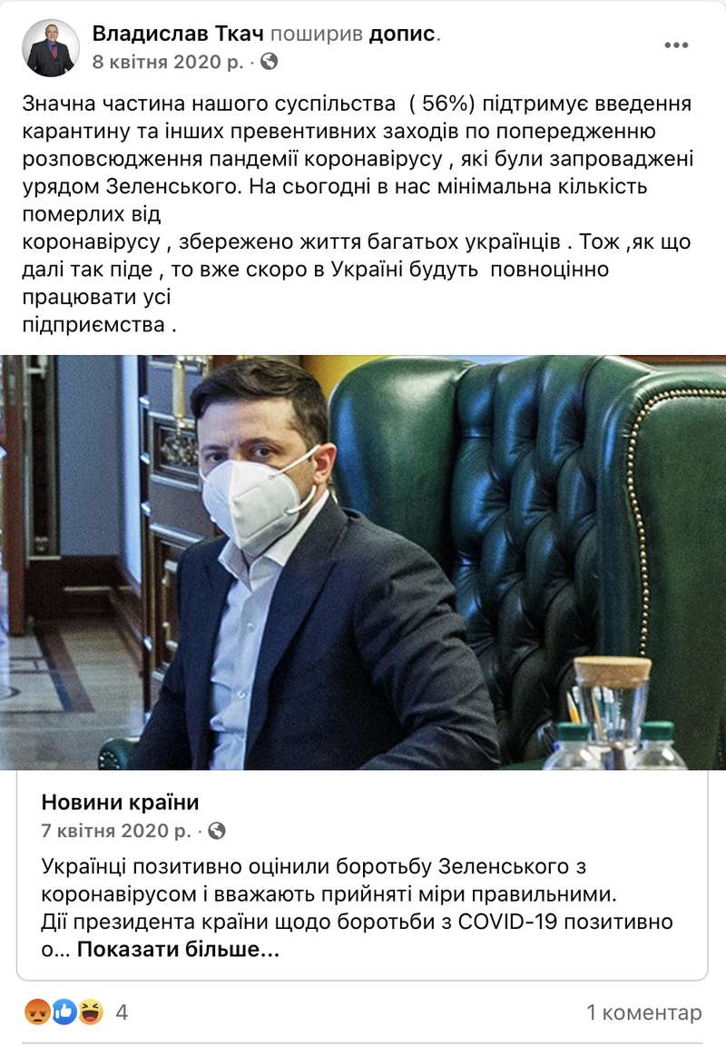 Інша сторінка, “Владислав Ткач” у групі “Новгород-Сіверський — рідна земля!”, поширює офіційні заяви ОП, пости все того ж Лямця, Охотіна, Подоляка, Андрія Єрмака тощо.