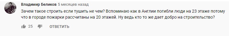 Даже не будем комментировать. Мы просто собрали отзывы с разных сайтов, а также под видеоматериалами о пожаре на незаконно построенном 34-м этаже данного здания.