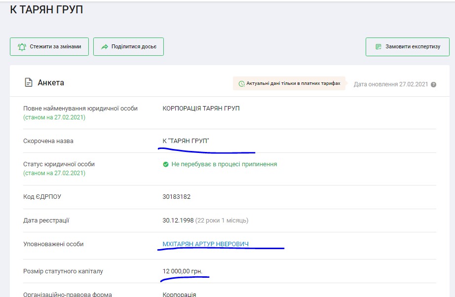 Второй застройщик – корпорация «Тарян групп» со статусным капиталом в 12 000 грн. Уполномоченным лицом выступает Артур Мхитарян.