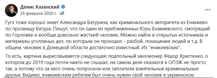 Фёдор Христенко, депутат ОПЗЖ, представитель «старых криминальных донецких» и по совместительству заместитель в ВСК Укрзализныци, тесно связанный с такими криминальными личностями, как Александр Батурин, который является приближённым Юрия Иванющенко (Енакиевского), в 2019 году на праздновании дня рождения жены Христенко в Москве, где устроил вечеринку стоимостью более 1 млн долларов, совершил ряд встреч с представителями ДНР для заключения или подтверждения контрактов поставок угля.