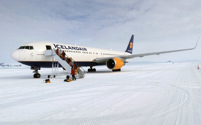 Широкофюзеляжный пассажирский самолет Boeing 767-300 авиакомпании Icelandair обычно перевозит пассажиров между Исландией и Америкой. Но на этот раз он совершил перелет из Рейкьявика в Антарктиду с посадкой на лед.