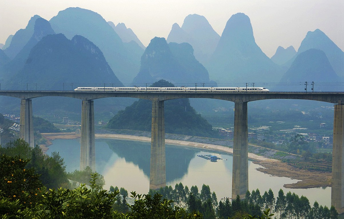 Высокоскоростная магистраль  Гуанчжоу-Гуйян. Со скоростью 250 км в час поезд проносится через 510 мостов и 236 туннелей.