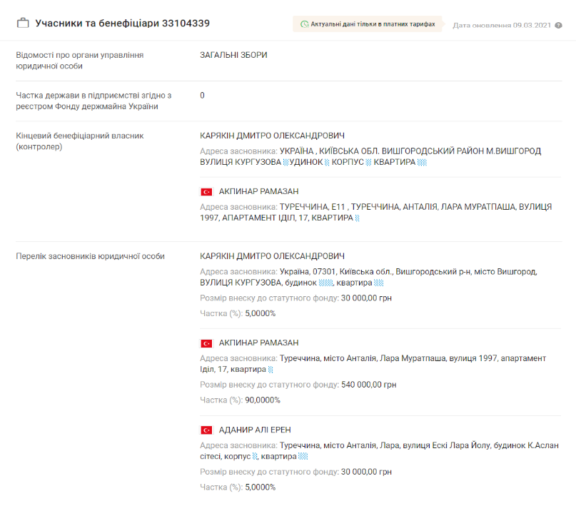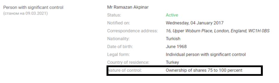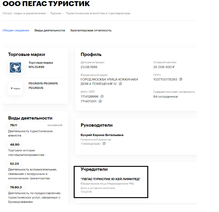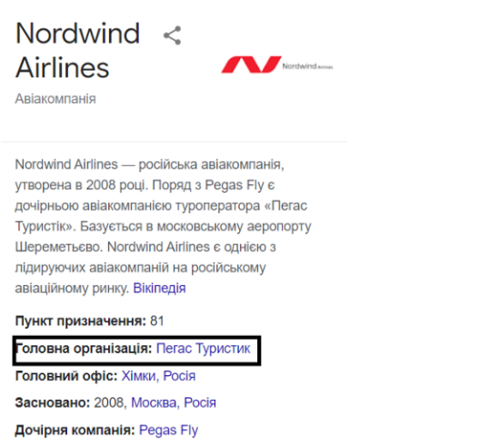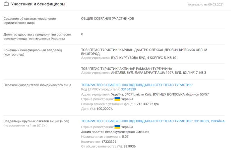 Туроператор надає послуги з організації відпочинку у понад 22 країнах, основними напрямками вважаються Єгипет та Туреччина. Саме ці країни наші громадяни здебільшого обирають, коли мова йде про відпочинок на пляжах за кордоном. dqxikeidqxiqqeantВ Україні цей туроператор зареєстрований як ТОВ «Пегас Туристик», основними бенефеціарами якої є: Дмитро Карякін, з часткою у 5% та два громадяни Туреччини – Аданир Алі Ірен, частка якого також складає 5%. Головний співвласник – Акпинар Рамазан, йому належить 90% компанії.На теренах нашої країни є декілька десятків компаній-партнерів, які продають тури від туроператора Пегас Туристик. Основний офіс знаходиться у Києві та, як видно з ресурсу «Юконтрол», ТОВ «Пегас Туристик» має три основні філії: Харкові, Одесі та Львові.До чого тут окупований Крим та авіаперельоти?Повернемось до основного власника ТОВ «Пегас Туристик» з часткою у 90% Акпинар Рамазана. Акпинар Рамазан володіє «PEGAS TOURISTIK UK LIMITED», яке зареєстроване у Великій Британії.Частка Акпинар Рамазана в британській компанії згідно реєстру складає від 75% до 100%. Саме ця компанія є єдиним власником російського OOO«Пегас Туристик».Ми не стверджуємо та не робимо висновків, що це є якимось чином протизаконно, цікаве в цій історії продовження. Російська OOO«Пегас Туристик» є основним власником авіакомпанії ООО «Северный Ветер», що на ринку відома як Nordvin Airlines.