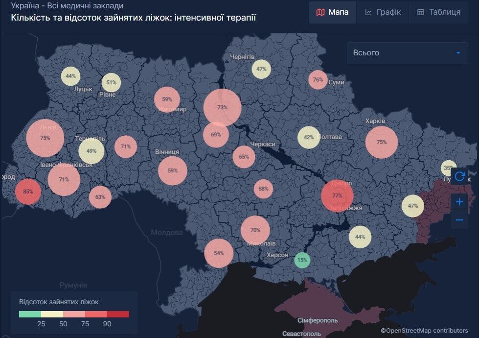В Черниговской, Сумской, Закарпатской, Черновицкой, Хмельницкой, Винницкой, Одесской областях этот показатель составляет 52-64%. В 11 регионах он не превышает 45%, и только на Луганщине и Херсонщине заполненность коек с кислородом менее 30% (24,3% и 14,9% соответственно).