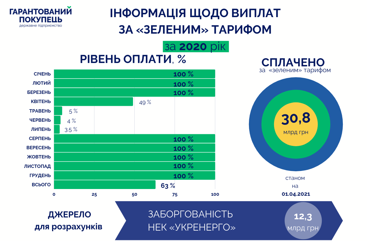 За даними держпідприємства "Гарантований покупець", на 1 квітня заборгованість "Укренерго" перед ним, яка є джерелом розрахунків за "зеленим" тарифом, становила 15,1 млрд грн (у т.ч. за 2021 рік - 2,8 млрд грн, за 2020 рік - 12,3 млрд грн), тоді як на 15 березня ця сума складала 17,2 млрд грн (у т.ч. за 2021 рік - 2,86 млрд грн, за 2020 рік - 14,3 млрд грн). "ГарПок" повідомляв, що 31 березня погасив борг перед "зеленою" генерацією за квітень 2020 року на 1,5 млрд грн.