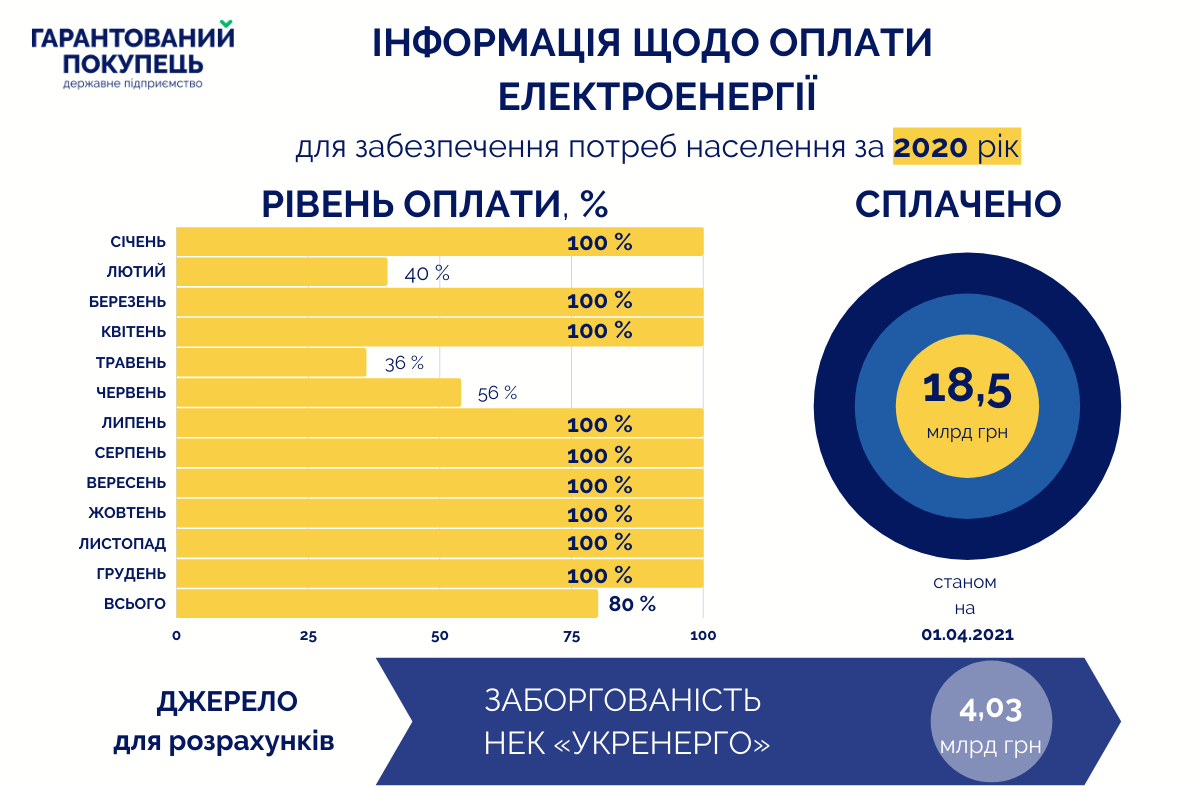 12.02.2021 ДП "Гарантований покупець" виплатив "Енергоатому" і виробникам "зеленої" електроенергії по 2,23 млрд грн (тобто сукупно - 4,46 млрд грн) у рамках погашення заборгованості за 2020 рік.