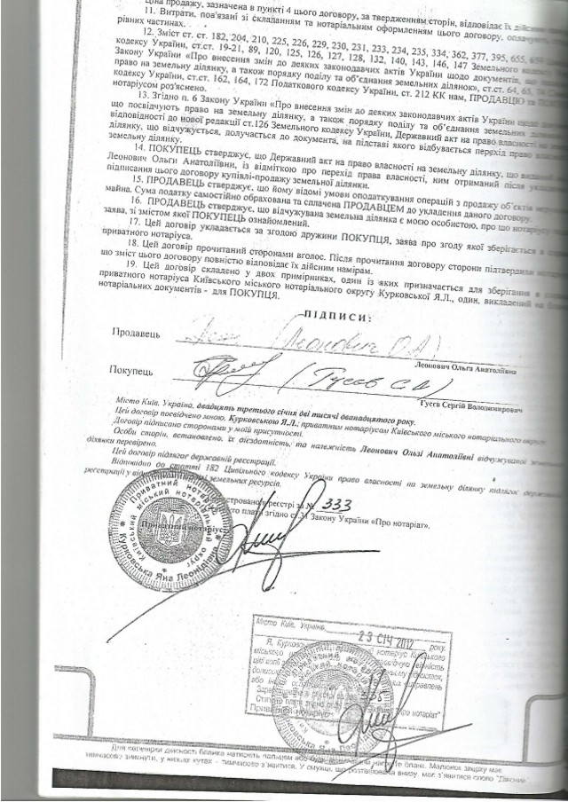 В 2012 году по другому договору Леонович перепродала этот участок киевлянину Сергею Гусеву. Сумма, обозначенная в документе, – 159 779 гривен.