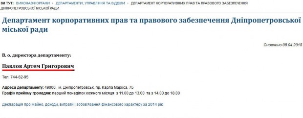 И.о. начальника Департамента корпоративных прав и правового обеспечения Днепропетровского городского совета стал Артем Павлов, который является помощником народного депутата Украины Бориса Филатова.