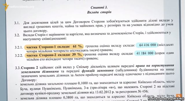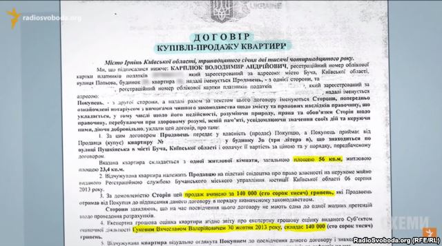 Втім, редакція «Схем» отримала контракти, за якими Володимир Карплюк продавав свої квартири. І, за документом від січня 2014 року, оселю у житловому комплексі «Річ Таун» площею 56 квадратних метрів підприємливий власник продає за 140 тисяч гривень – а це 2500 гривень за квадрат.