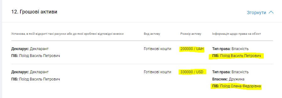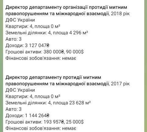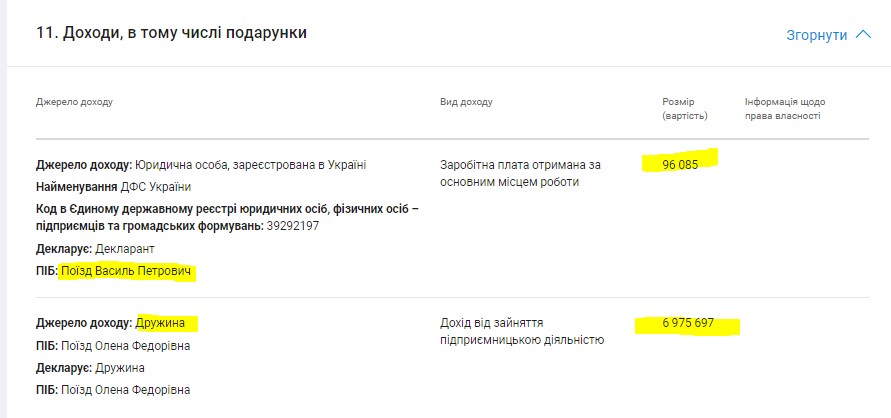 Ну, здесь вообще аншлаг. Если посмотреть на доходы Василия Петровича, то можно подумать, что всю семью содержит его жена. Ее задекларированный доход от предпринимательской деятельности составил за прошлый год почти 7 миллионов гривен. А вот единственный задекларированный источник дохода Васи Поезда – его зарплата по основному месту работы, то есть в ДФС, за 2020-й год составила 96 тысяч гривен. Учтем при этом, что он был еще при должности только пару месяцев. А дальше? Смотрел футбол, посуду дома мыл, садил помидорки на даче? Ну, такое…