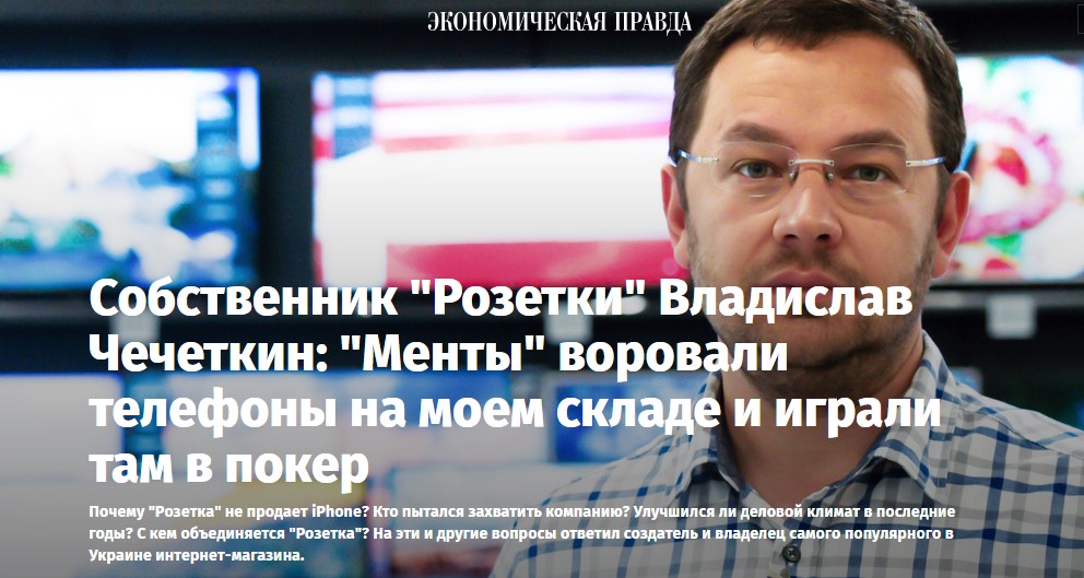 В интервью популярному изданию «Экономическая правда» владелец «Розетки» Владислав Чечеткин рассказал все шокирующие подробности того обыска, который длился целый месяц. А именно, налоговая милиция, пришедшая с обыском, вымогала у него 1 миллион баксов наличкой. Затем вымогатели увеличили сумму в 6 раз, а также полностью заблокировали работу «Розетки», растянув обыски на 31 сутки.