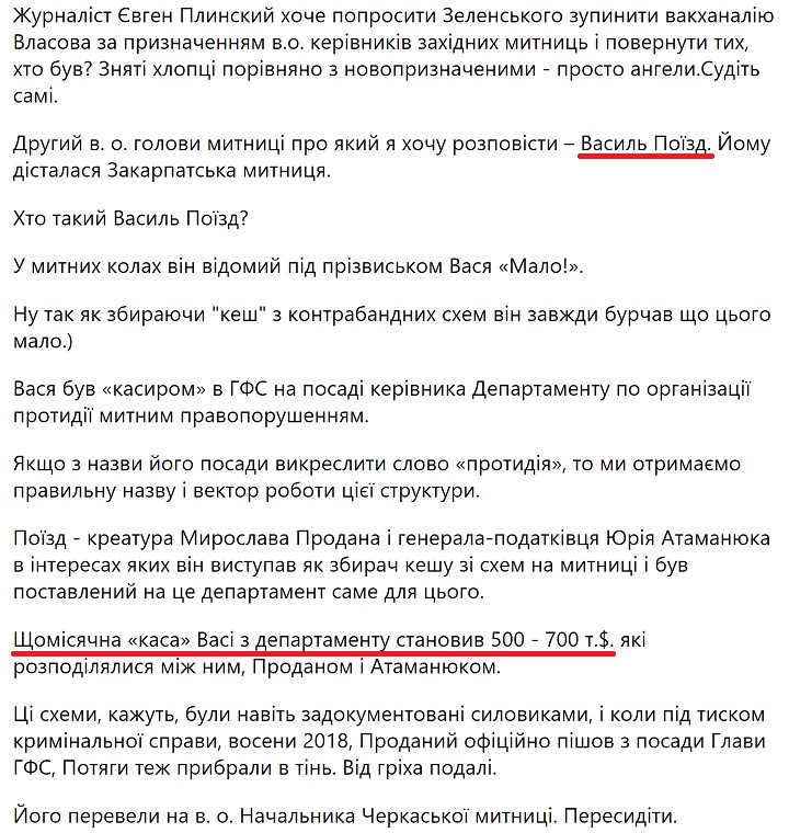 Но, по сути, здесь нет ничего удивительного. Ведь Василий Поезд – это протеже Продана и Атаманюка. Именно Вася собирал кеш по схематозам на таможне. А поставили его руководить нужным департаментом именно для этой цели. Как писал известный украинский журналист Евгений Плинский, ежемесячная «касса» Василия Поезда во время работы в ГФС составляла от 500 000 до 700 000 долларов.