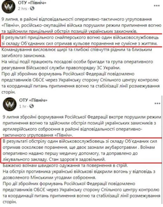 Ранее спикер командования Объединенных сил Лидия Нанивская сообщила, что наши боевые потери на Донбассе за девятое июля исчисляются одним погибшим и тремя легко ранеными военнослужащими.