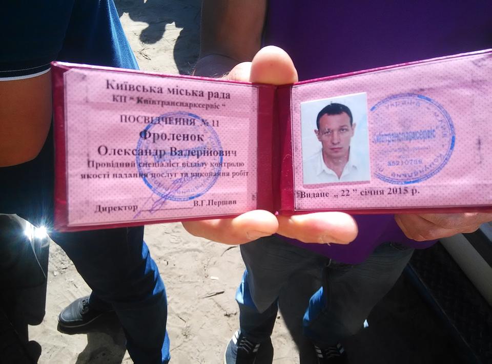 Так же бегал какой-то представитель "Киевпарктрансервис" (сделали фото удостоверения), по говору и поведению напоминал гопника, когда выключались камеры, он просто подходил к людям и пытался запугать (одному автомобилисту сказал, что напишет заявление о наезде, другим угрожал тем, что сейчас отдаст корочку и решит проблему силовым путем)...