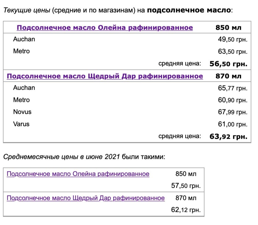Сети супермаркетов, по состоянию на 23 июля, показали изменения ценников на подсолнечное масло на примере "Олейна" (850 мл). В Metro оставили стоимость продукта без изменений - 63,50 грн, однако в Auchan снизили цену до 49,50 грн (-8,2 грн по сравнению с началом июля).