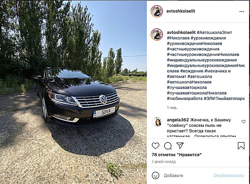 В комментариях под этим постом отметили, что владельцем этого автомобиля является владелица николаевской автошколы «Элит» Евгения Федоришина, добавив скриншот с фото Volkswagen с номерами SOVA на ее странице в Instagram.