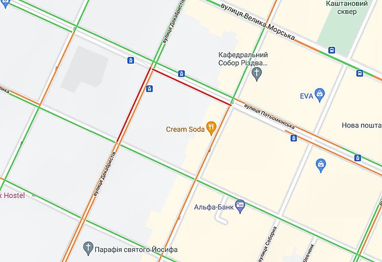 Отметим, что по данным гугл-карты, на перекрестке Потемкинской и Декабристов там временно была автомобильная пробка.