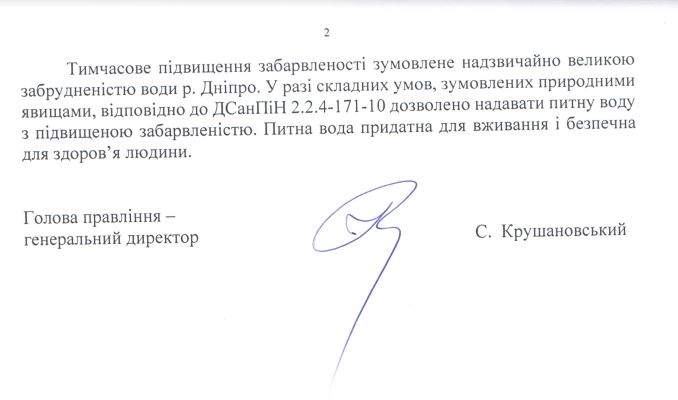 По результатам проверок установлено, что качество воды соответствует действующим Государственным санитарным нормам, и она является безопасной для употребления. А желтоватый оттенок воды вызван сильной загрязненностью реки Днепр, – говорится в документе за подписью руководителя Киевводоканала Сергея Крушановского.