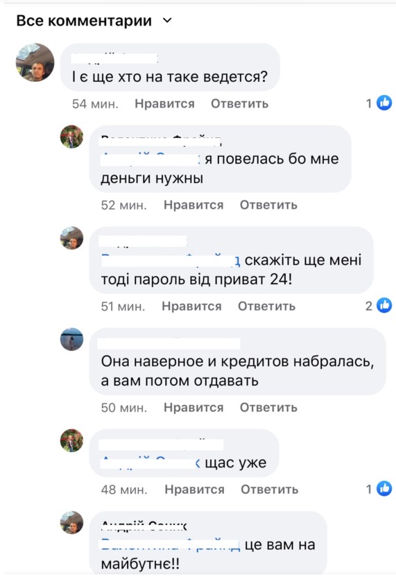 «Наверняка на вашу карту уже набрали кредитов, и выплачивать их вам», — вразумил женщину другой пользователь.