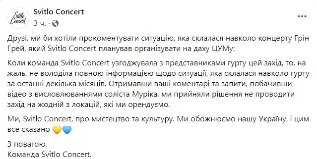 Тем не менее, 5 августа стало известно, что концерт на открытой террасе на Крещатике не состоится. Организатор мероприятия — команда Svitlo Concert — тоже ознакомилась с видео в Instagram и объявила, что считает неприемлемой позицию музыкантов по поводу украинского языка.