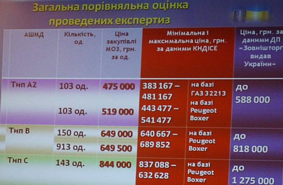 За результати тендера міністерство заплатило за 103 машини типу "А2" 475 тис грн за штуку, за 103 машини "А2" - 519 тис грн за штуку, за 1 063 машини типу "В" - 649-649,5 тис грн за штуку, і за 143 одиниці типу "С" - 844 тис грн за штуку.