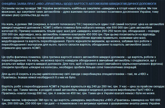 За інформацією "Наших грошей", фірма не є "новачком" на ринку "швидких", але у таких кількостях ніколи їх не поставляла. У її портфоліо можна знайти реанімобілі для МВС, СБУ та Нацбанку, проте це замовлення навіть не на десятки машин.
