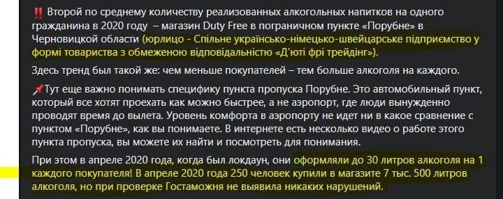 Согласно данных таможни, рекорд "фикции" установила ТОВ "Д’юті Фрі Трейдінг", которая в отдельные месяцы продавала по 30 литров алкоголя на каждого кто пересекал границу.