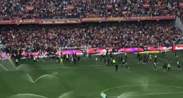 Как видно на кадрах с места событий, в то время как фанаты вырвались на поле, на нем включили системы полива. Потом матч продолжился и закончился счетом 1:0, выиграл "Ланс".