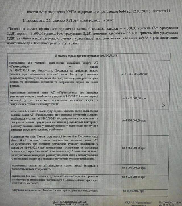 Согласно условиям договора, АО "Укрэксимбанк" должно оплатить адвокатскому объединению A.D.HOC до 11 760 000 грн в случае удовлетворения или частичного удовлетворения кассационной жалобы финучреждения и отмены решений судов предыдущих инстанций относительно правомерности аукциона. До 3 920 000 грн получит A.D.HOC в случае признания результатов аукциона недействительными судом первой инстанции (в случае частичного удовлетворения кассационной жалобы Верховным Судом), "привлечение согласованного с Банком Ликвидатора в деле о банкротстве" Укрэксимбанк оценивает в 392 000 грн.